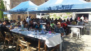 El tercer equipo se dedicó al traslado de mesas, montaje de carpas y generar toda la infraestructura para poder comer. Estupendas carpas de la Comarca y mobiliario del Ayuntamiento. A las 13,30 h comimos. La plaza de Laguarta, se llenó. Se llenó de gente, de buen humor, de disfrute y de comunicación. Convivimos.